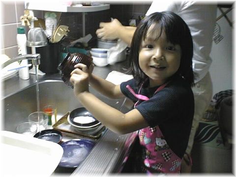 今日、千佳専用のエプロンを買ってもらったので皿洗いのお手伝いをしています。いつまで続くかな?