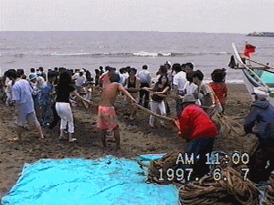 午前中、第二回目の「地引き網」の様子。皆さん一生賢明、網を引いていますが、ほとんどの人は後ろで立ち見したり、酒を飲んで眺めていました。 (網元のオジサンが真面目に網を引け!とぼやいてましたょ) 来年は全員参加で網を引きましょう。 この時も「アジ」が大漁でした! 「アジのたたき」は美味しかったな〜 クーラーBOX持参の人は、たくさんのアジを持ち帰っておりました。 |