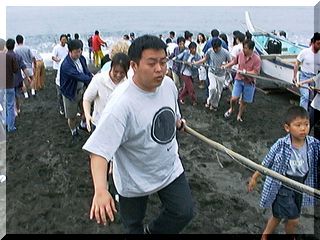 1回目の「地引き網」の様子。朝早いにもかかわらず各方面から参加した人達により、ゆっくりと網が引かれました。 さてさて、結果はいかに。。。 |
