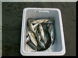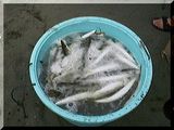 2回目の網が引かれて、バケツの魚に群がる男衆! この時も、カマス、イカ、太刀魚、アジが少々水揚げされただけでした。せっかく大きめのクーラーBOXを持って来たのに残念。 |