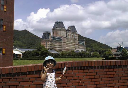 ![]() | グラバー邸にて。グラバー園には他にリンガー邸、オルト邸、ウオーカー邸などの洋館もあります。千佳はここのお土産屋さんで買った「ドラミちゃん」のウチワがお気に入りで、旅の間手放す事はありませんでした。この後の千佳の写真に注目して下さい。 |