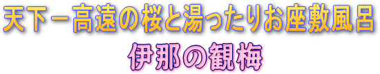 ◆日時:平成17年4月16日(土)〜17日(日) (夜行日帰り)◆集合場所:JR新宿駅西口安田生命前・奥玉郷友会旗の所 20:00 ◆参加人数:20名以上 バスは人数に合わせます。 ◆参加費用:¥17,000 ※バス代、入園料・健康ランド代・朝食代・昼食入浴代・保険代含む ◆申し込み締め切り:平成17年3月15日(火) 【行程明細】 ◆4/16(土)〜新宿・・・(中央道)・・・石和健康ランド 20:30 22:30頃着 17(日)(仮眠・朝食)・・・(中央道)・・・信州高遠城跡公園(天下一高遠コヒガンザクラ見物) ・・・伊那梅花(梅のお花見)・・・蓼科温泉・ホテル親湯(昼食・名物お座敷露天風呂など) 12:00 〜 14:30 ・・・(中央道)・・・新宿 18:00頃 ・高遠のコヒガンザクラは樹齢100年を超える老木を含め現在では約1500本の樹林となっています。県の天然記念物の指定を受けています。 ・ホテル親湯は世にも珍しいお座敷風呂です(写真左)。転んでも痛くない冬でも暖かい安心してご入浴頂ける人に優しい大浴場です。 |