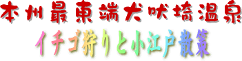 ◆日時:平成18年3月19日(日) 8時15分 ◆集合場所:東京駅丸の内口 丸ビル前 ◆最少催行人数:15名 (バスは人数に合わせます) ◆参加費用:¥9,000 ※バス代、いちご狩り、昼食費、入浴費、他 ◆申し込み締め切り:平成18年2月20日(月) (お申し込みは奥玉郷友会事務所) 【行程明細】 ◆3/19 東京・・・(東関東)・・・東庄町・いちご狩り・・・ 8:30 犬吠埼・京成ホテル(温泉です!・休憩)・・・佐原(小江戸・蔵の町見学)・・・・(東関東)・・・東京 12:00 〜 14:00 15:20 〜 16:00 18:00 ・ホテルの天然温泉元湯は、素肌を引き締める肌美人の塩湯です。 まーるい水平線を眺めながらゆっくりおくつろぎ下さい。 ・いちご 有機肥料で栽培しています。 犬吠埼温泉のご紹介