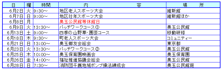 四月二十三日に開催された奥玉体育協会総会で、今年度の事業計画や予算が決定しました。なお、役員の改選も行われ、会長に菅野房夫さん(三沢)副会長に金弘則さん(町下)、吉田進さん(宝築)が選任されました。 なお、事業計画では、新規事業として自治会対抗のグラウンドゴルフ大会が七月五日(日)に、親水公園で開催されることも決定しました。