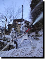 ※写真は、厳しい寒さの中で訓練が行われた「文化財防火デー火災防御訓練」
