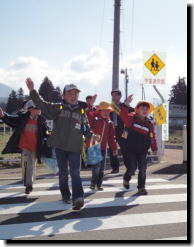 (写真:先輩のお兄さんやお姉さんたちと通学を始めた新一年生)