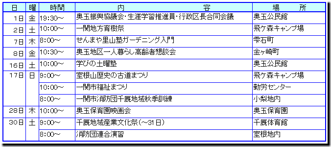 冷夏だと予報されたはずが猛暑になり、日本中が、今まで経験したことのない体温以上の暑さになるなど、皆さんも、体調管理には苦労されたことと思います。 ところが、九月も後半に入ると、一転、十四〜五度と冷え込み、真夏から冬に一気に入った感じがします。この異常気象が、野菜などの生育に影響して、値段にも跳ね返って、家計にも響いてきています。さて、これから、秋の行事が目白押しで地区民運動会に始まり各自治会の運動会、地区民芸大会と続きます。農作業も繁忙期を迎えますが、けがなどされないように、年齢と相談しながらご健闘願います。 |