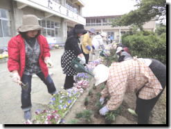 第1回目は、講師を務める柴田満喜子さんの御縁で、東日本大震災で避難所となった大船渡市立猪川小学校を訪れ、同校の花壇造りを行いました。28人の受講者は、校舎前にある全長約60メートルの花壇に肥料をまき、マリーゴールドやサルビアなど約600本の花苗を復興を祈りながら植え付けました。 受講者からは「がれき撤去など力仕事はできないが、ぜひ東日本大震災の被災地を応援したかった」「花を見てもらうことで、少しでも元気を出してもらえれば」等の声が聞かれました。