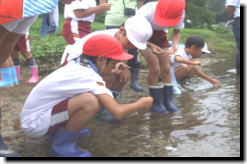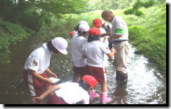 奥玉小学校の四年生は、総合学習と奥玉公民館の少年奉仕体験講座として、8月25日と9月12日の2回、千厩川の水質調査を行いました。1回目の講座は、環境アドバイザーの千田典文さんを講師に迎え、奥玉地内天梅橋付近で水生生物の採取を行いました。調査の結果、沢ガニ、かげろう、トビケラ、少し汚れた水を好むタニシも発見され、川は少しだけ汚れつつあるように感じました。 2回目の講座では、千田典文さんに加え、千厩川をきれいにする会代表の千葉克知さんを講師に迎え、千厩地内梅田橋付近で水生生物の採取、水質調査を行いました。調査を開始したところ、川の水底には大量のカビと水からの匂いが確認されました。このあたりでは家庭用雑排水、事業所などの排水が入り込み、かなりの汚れを感じました。 今回の調査を終え、川をきれいにするために自分たちが今できることは何かを考え、川は大切にしていかなければならないと強く感じたようです。