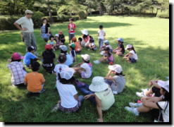 「英会話を日常的に」と開催されている学びの土曜塾の移動講座が8月27日開催され、花巻広域公園で、ネイチャーゲームなどを楽しみました。 参加した奥玉小学校の1年生から5年生30名は、常任講師の四日市由美さんと、アンソニー・バッシュさん(花巻市在住)の指導を受け、公園内の探検や、動植物の英語名の由来などを学習しました。 学びの土曜塾では、今後ハロウィーンや感謝祭などを予定し、外国の風習と日本の文化の違いを学習しながら英会話を身に付けていく予定です。