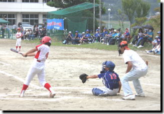 (写真)盛り上がる野球交流奥玉大会の1コマ(奥玉小学校グラウンドにて)