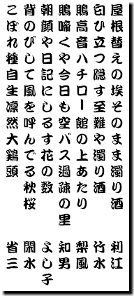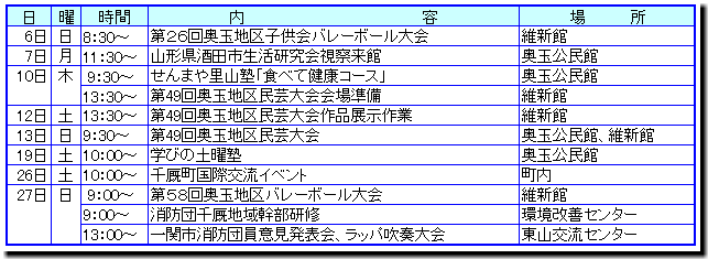 奥玉地区練習日程・会場割当表 月日 練習チーム 11月1日(火) 町下・「寺崎前、花貫」・宝築 11月2日(水) 大平・天ケ森・「中日向、三沢」 11月3日(木) 町下・「寺崎前、花貫」・宝築 11月4日(金) 大平・天ケ森・「中日向、三沢」 会場:維新館練習時間:午後7時〜午後8時30分
