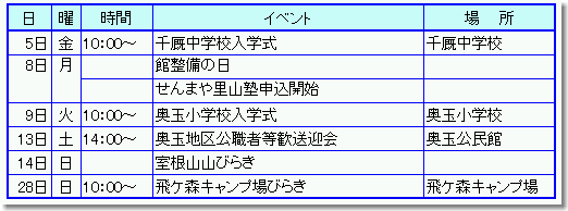 飛ケ森キャンプ場のシーズンを告げるキャンプ場びらき行事が、4月28日、現地で開催されます。当日は、奥玉小学校の森林愛護少年団による「緑のメッセージ」の朗読や安全祈願祭が行われるほか、様々なアトラクションを行いますので、お誘い合わせの上、お集まり下さい。なお、雨天の場合は、大平集落センターに会場を移動して、各種行事を行います。