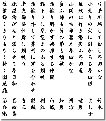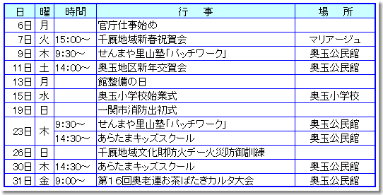 今年も残すところ、あとわずかとなりました。公民館や維新館の利用者の皆さんには、お忙しいところ施設の清掃奉仕にご協力をいただき本当にありがとうございました。きれいな施設を皆さんに利用していただきたいと日々清掃していますが、広い施設なので、手の回らないところが多く、皆様からの応援が何よりで、きれいな施設で、明るいお正月を迎えたいと考えます。皆様、良い年をお迎えください。