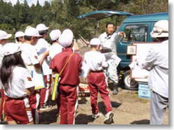 9 月18 日(木)には、奥玉地元学研究会の皆さんを講師に迎えて、奥玉地区内の史跡を巡り地域の歴史を学ぶ「奥玉探検」を実施しました。最初に玉堀山(大東町摺沢)の水晶採掘跡を訪ね、水晶の欠片を探しながら奥玉の地名の由来について学びました。その後、桜森神社や橘城跡を見学して奥玉の歴史について学んだほか、三枚山鉱山跡を見学して、昭和19 年に閉山するまでの金採掘の歴史について学びました。また、黄銅鉱や黄鉄鉱などの鉱石を実際に触らせていただき、その重さに驚いていました。駆け足の行程でしたが、子供たちにとって自分たちが住む地域の歴史に触れる貴重な体験となったようです。