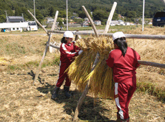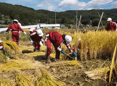 9月22日(金)に、吉田常夫さん(入山沢)を講師に迎えて稲刈りを行いました。最初に、稲がどのような様子になったら刈り取りの適期かなどを解説していただき、稲の結束の仕方を練習してから稲刈りを始めましたが、慣れない鎌の扱いにみんな悪戦苦闘の様子でした。刈取り終了後は、はせ掛けを行いましたが、はせ掛けのやり方をマスターしている児童がいて、吉田さんが説明しなくてもてきぱきと作業を進めてくれたので驚きました。