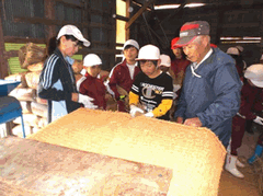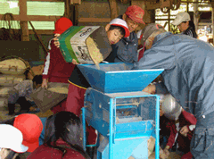 10月10日(金)には、入山沢の菅原一郎さん宅の倉庫をお借りして脱穀・籾摺作業を行いました。今年も機械には頼らず、昔ながらの足踏み脱穀機での作業です。最初は稲のあて方が分からず、脱穀機に稲を巻き込んでしまう児童がいましたが、何度かやるうちにコツを掴んだようで、後半にはきれいに籾が外れるようになりました。選別作業も、昔ながらの「もみとおし」と「唐箕」を使って作業を行いました。今年の収量は、玄米で38キログラムとなり、講師の吉田さんからは「今年は豊作」「きれいな米だ」と、お褒めの言葉をいただきました。 収穫した米は、奥玉小学校の収穫祭で試食する予定です。