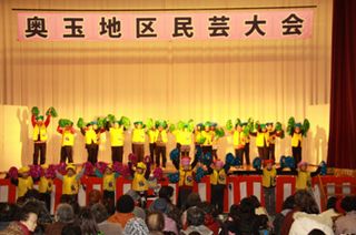 芸能発表会では、奥玉小学校1・2・3年生の表現や奥玉保育園児のお遊戯が披露されたほか、地元の神楽や打ちばやしなどの伝統芸能、各種舞踊や詩吟、大正琴など、様々な団体の皆さんが日頃の練習の成果を余すことなく発揮、その見事な演技に会場は大いに盛り上がりました。プログラムの最後には、出演者や各自治会の皆さんが揃いの法被で「奥玉音頭」を踊り、楽しい雰囲気の中でフィナーレを迎えました。