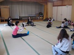 講師には、ヘルスケアワーカーの畠山洋子さん(気仙沼市)を迎え、親子で音楽に合わせてストレッチや体操で体を動かしました。3歳までの小さな子供たちが参加しましたが、お母さんたちと元気いっぱいに頑張りました。