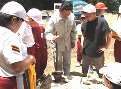 最初に大東町摺沢の玉堀山を訪れ、奥玉の地名の由来となった水晶がこの地で採掘されたことを学習しました。水晶の欠片を探したところ、結構きれいな水晶を発見できたので、みんな大事に持ち帰っていました。続いて櫻森神社を訪問して、奥玉の地名の由来となった神社の歴史について学び、研究会員の方が所有する直径10cmの水晶の玉を拝見しました。この後、橘城跡、三枚山鉱山跡、室根山参道口と巡って地域の歴史を学びました。特に三枚山鉱山跡地では、「三枚山」という名前がついた由来や、昭和19年に閉山するまでの歴史について学習したほか、手作業で金鉱石を掘っていた時に使われていた道具を使い、石を割る作業や、鉱石を細かくする作業などを実際に体験して、当時の作業の大変さを実感した様子でした。
