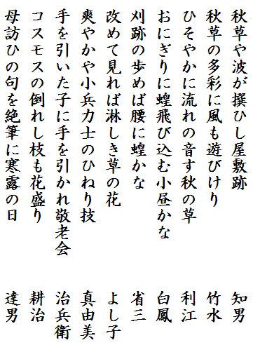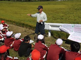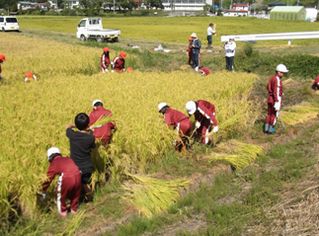 9月15日(火)に、吉田常夫さん(入山沢)、加藤正勝さん(宿下)を講師に迎えて稲刈りを行いました。最初に、稲がどのような様子になったら刈り取りの適期かなどを解説していただき、稲の結束の仕方を練習してから稲刈りを始めましたが、慣れない鎌の扱いにみんな悪戦苦闘の様子でした。 また、前の週に雨が続いた後で田んぼが渇いていなかったため、みんな裸足になって泥だらけになりながら作業を行いました。
