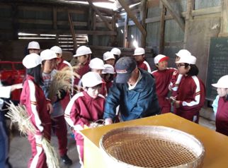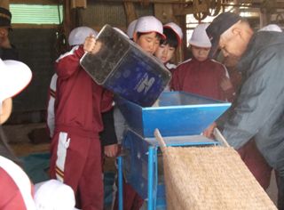 最初は稲のあて方が分からず、脱穀機に稲を巻き込んでしまう児童がいましたが、何度かやるうちにコツを掴んだようで、後半にはきれいに籾が外れるようになりました。選別作業も、昔ながらの「もみとおし」と「唐箕」を使って作業を行いました。今年の収量は玄米で27.5キログラムとなり、昨年に比べると11キログラムの減収と少し残念な結果でしたが、きれいなお米が穫れました。収穫した米は、PTAの親子レクでお握りにして試食するそうです。