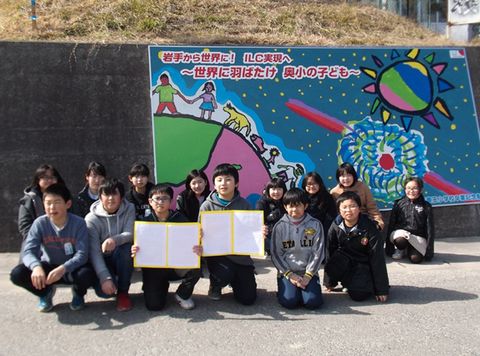 奥玉小学校6年生14人は、次世代の大型加速器「国際リニアコライダー(ILC)」の計画実現を願う看板3枚を卒業記念品として制作し、11日(金)には同校の正門前で看板のお披露目式が行われました。