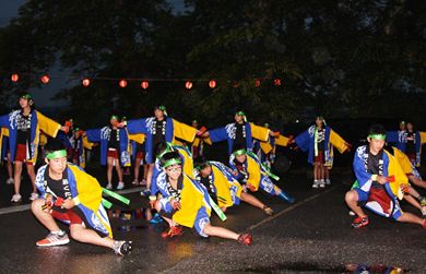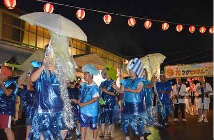 特別ステージには気仙沼市から太鼓学舎「ね」の皆さんが5年ぶりに出演しました。雨のため維新館に場所を移してのステージとなりましたが、迫力ある太鼓の演奏に会場が沸きました。なお、仮装盆踊り大会の審査結果は、最優秀賞が天ケ森自治会の「ようこそ!天ケ森水族館へ」、優秀賞が大平自治会の「がんばろう熊本 桜の郷大平から」、優良賞が寺崎前自治会の「お盆七夕」、敢闘賞が三沢自治会の「三沢のマトリョーシカ」でした。