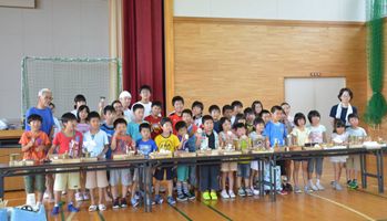 8月4日(木)に、とびがもり水車音楽祭関連企画として工作ワークショップが開催されました。音楽祭に協力する湘南台造形教室の新澤悟郎さんを講師に迎え、奥玉小学校と清田小学校の児童34名が参加し、いろいろな種類の歯車を自由に組み合わせて、カラクリを作りました。 講師から説明を受けた後、工作開始。普段使い慣れない工具などを使用しましたが、スタッフやジュニアリーダーに協力をもらい、真剣に取り組みました。 サプライズで小山晃さん(三沢)からトウモロコシの差し入れがあり、子どもたちは大喜び。参加者全員でおいしくいただきました。