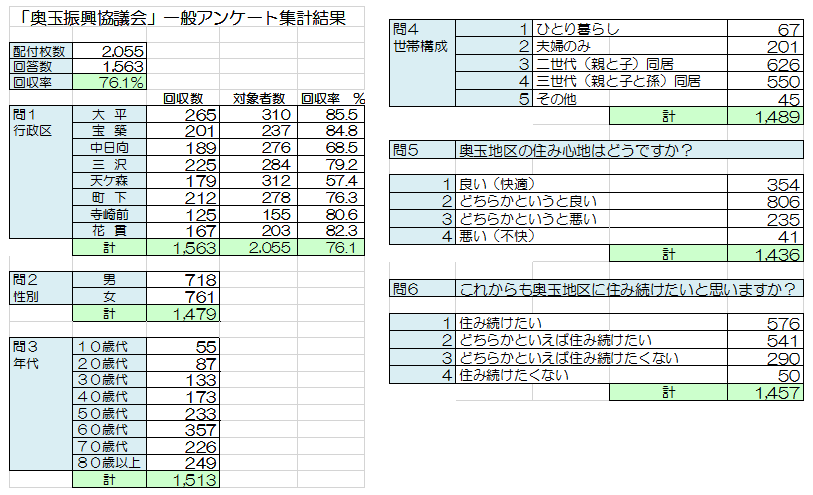 今年度、奥玉振興協議会では、「明るく元気で安心な地域」であり続けるための方向性を明確にするために、「奥玉地区地域づくり計画」の策定に取り組んでいます。この計画は、できるだけ多くの住民の希望や意見を尊重し、課題を整理しながら、その解決に向けた取り組みを行動計画にまとめるものです。その一環として6月中に実施した住民アンケート調査は、小学校5年生以上の奥玉地区在住者全員を対象に行ったものであり、その集計概要がまとまりました。これから、アンケート結果を基に各自治会から選任された計画策定検討委員などによるワークショップ等を開催しながら、検討や意見交換を重ね、地域の将来像実現に向けた目標やスローガンの設定、分野別の基本方針の決定など具体的な計画づくりが進められていきます。