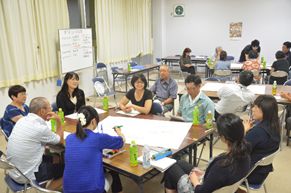 第3回策定検討委員会が8月23日に開催され、第1回ワークショップ(通称:あらたま談義)を行い、アンケート結果を基に地域づくり計画策定のための地域課題の整理や解決に向けたアイディアが話し合われました。初回は、「10年後の奥玉こんな地域にしたい」をテーマに2グループで話し合いが行われました。