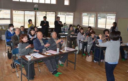 奥玉振興協議会が主催する地域福祉推進事業「こんにちは 響生様」が、3 月2 日(木)にNPO 法人響生を会場に開催され、地域住民22 名が参加しました。この事業は、奥玉振興協議会で策定した「奥玉地区地域づくり計画」に基づく初の取り組みで、地域内の社会資源を正しく理解することを目的としています。NPO 法人響生は旧奥玉保育園跡地にあり、主な事業内容は「放課後等デイサービス リトル・ピース」、おやこ広場「てって」(一関市からの受託事業)、まちづくりに関する事業などです。施設内を見学後、響生で行っている事業について、杉山浩理事長をはじめ職員の皆さんからスライドを見ながら説明を受けました。杉山理事長からは、響生に対する奥玉地区の皆さんの協力・支援に対する感謝の言葉と、これを機に今後も連携していきたいとのお話がありました。また、響生では、音楽をもちいて子どもたちのコミュニケーションする力をはぐくみ、発達を促すことを目的に音楽療法を行っており、音楽療法士の杉山ふみさんの指導で参加者の皆さんもカスタネットを使って、大人の音楽活動を体験させていただきました。参加者の皆さんは保育園だった時は何回か来たことがあるものの、響生で運営するようになってからは「初めて施設を訪問した」という方が多く、質問等も活発に出され、どういう活動をしているか理解を深めたようでした。昭和41 年に建てられ、今年で50 年になる建物を大切に使っている様子もわかりました。
