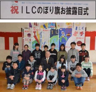 奥玉小学校6年生児童22 名による卒業記念品として制作した「ILC のぼり旗」のお披露目式が、3月5日(日)に奥玉小学校で開催されました。こののぼり旗は、ILC の実現を願い制作されました。2人1組で原画をデザインし、完成した11 枚の原画を印刷業者に委託してのぼり旗にプリントしました。今後は、こののぼり旗を学校や学区内に設置し、ILCの魅力を発信していきます。お披露目式には、6年生児童とその保護者、教職員、協力をいただいた企業各社や市関係者等が出席し、完成を喜び合いました。