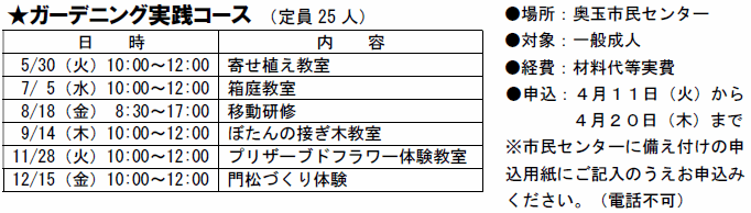 千厩地域内の4市民センターでは、平成29 年度も住民の皆さんを対象とした生涯学習講座を開設いたします。奥玉市民センターでは、「ガーデニング実践コース」と「食べて健康コース」の2コースを開設いたしますので、ぜひ、この機会にご応募ください。