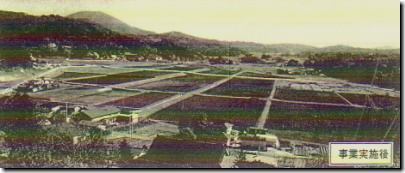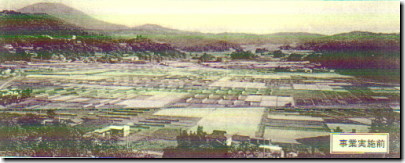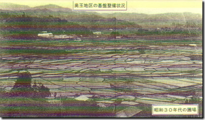 奥玉沖中地内の様子をご覧下さい。右の図面は、今から183年ほど前に作られた「文化14年(1817)の中奥玉村絵図」です。太い(水色)線が、川(水路)です。下の図は、上から昭和30年頃の水田、次が県営基盤整備をする前の水田(昭和34年頃に一度整備済み)、下が昨年(平成14年)の春の沖中から室根山をみた様子です。時代時代を語りかけてくれるような写真ですが、みなさんの所に昔懐かしい写真等ありましたら、奥玉公民館にご紹介下さい。 |