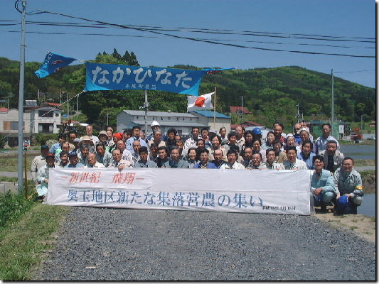 ―――新世紀 新たな飛翔―――「奥玉地区集落営農の集い」が、奥玉の中日向水田付近を会場に16日に開催されました。 奥玉地区営農組織連絡協議会(佐藤正男会長)が主催したもので、約100人が参加しました。主催者・来賓あいさつに続き農作業安全祈願が行われました。1町歩水田区画での8条乗用田植え機による県千厩地方振興局の岩渕良昭局長ら3人が体験し(写真上)、地元の担い手の菊地さんが「集落営農の誓い」をし、全参加者による記念撮影(写真下)をしました。 この後、会場をなかひなた会館に移し、昼食懇談が行われ、カントリー米によるおにぎりやすいとんデザートは千厩が生んだ「酪農かあちゃん・こだわりアイス」が振る舞われました。懇談では、各営農組合長や振興局長、普及センター所長らから明日の農業について熱く語られ、新たな飛翔を印象づけた集いでした。(文責・村上福) ★岩手日日新聞 5月17日記事はこちら |