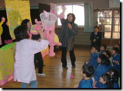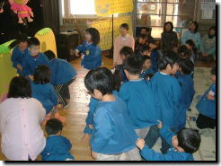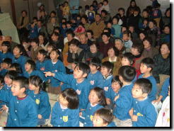 奥玉保育園家庭教育学級が1月12日午前、奥玉保育園ホールを会場に「子どもたちに愛とやさしさを」と題して北上市・ボッケ座の菅野弘さんから歌やお話し・人形劇で園児・父母・祖父母らが鑑賞しました。(写真下)はじめに、村上奥玉公民館長から紹介やあいさつがあり、ボッケ座の方々から、元気に歌やお話をいただきました。 玉入れの歌などでなごやかに大きな拍手や声援が飛び交いました。そして創作みんわ人形劇の心あたたまる「さくらっこちゃん」が上演されました。あらすじは、森に大きなさくらの木があり、さくらっこちゃんやうさぎのピョンちゃんとたぬきのポンちゃんは、さくらもちをつくりました。そこに鬼が現れ、さくらもちやだんごなどを食べてしまいます。さくらっこちゃんと森のみんなで退治する大活躍の愛と感動のものがたりでした。鬼がでてくると、こどもたちも「食べてだめ〜」と大きな声で教えたり、さくらっこちゃんに「負けるな、がんばれ」の大きな声と身を乗り出して声援を送り、桜の花びらで鬼が小さくなった時は、歓声に包まれました。子どもたちも正しいことと愛することの大切さを感じた一時でした。 会場には父母・祖父母ら50名が参加し、園児と一緒になって拍手や声援・歌で楽しみました。今回は、趣向を変えて、奥玉福祉活動推進協議会からの援助もあり公演が実現したものです。