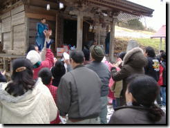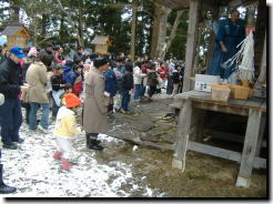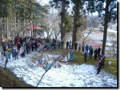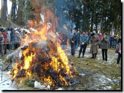 1月14日午後、桜森神社境内でどんと祭が行われました。お正月のしめ飾りなどを納め、町下・天ヶ森の地区民や子供会員地区民など約150名が参加し、今年1年の無病息災・家内安全・防火等を祈りながら火が入れられました。 今年厄年の62歳の小野寺洋吉さん(天ヶ森)と及川敏政さん(町下)等がみかんや富くじ入りもち・お菓子をまき、老いも若きも夢中になって福を拾っていました。