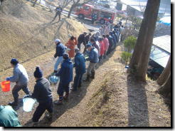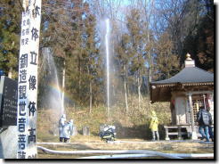 1月28日午前、奥玉地区内の一関市指定有形文化財「林ノ沢観音堂」を会場に一関市千厩地域「文化財防火デー」の文化財防火訓練(一関市教育委員会等主催)が実施されました。藤堂隆則市教育委員会教育長を統監の下で、天ヶ森・町下自治会員ら70名と教育委員会文化財関係者、一関東消防署・千厩地域消防団員・奥玉婦人消防協力隊員ら80名の150名が参加。通報・放水・たきだし訓練、バケツリレーや消火器操作がきびきびと多彩に行われました。 訓練では、観音堂付近で山林火災が発生したとの想定で、119番通報、サイレンが鳴ると同時に地区民らがバケツリレーの中、文化財を搬出。消防署や分団からタンク車や消防車が到着し、放水が行われました。 婦人消防協力隊員らも炊き出し訓練と地区民による消火器操作訓練も行われ、多彩かつ大がかりに実施され、訓練の講評が小野寺勲一関東消防署長からあり、観音堂別当の菅野福男さんらから「過去に火災にあっている。貴重な建物・文化財であり、みんなで守っていきましょう。」とあいさつがありました。 参加者に終了後、観音堂に保管されている「園通」の額や「銅像観世音菩薩」も紹介され、改めて文化財を守る大切さを認識した訓練でした。