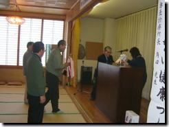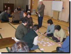奥玉地区第9回お茶ぱたきカルタ大会(奥玉老人クラブ連合会・奥玉公民館共催)が、1月30日奥玉公民館日本間で6チーム50名参加のもと開催されました。藤野福男大会長からのあいさつと畠山春男審判長から競技上の注意があり、トーナメント方式で、「読みます。」の合図でスタート。各老人クラブの男女4人が1組の選手は、日頃の練習成果が発揮され、お手つきがあったりしたものの真剣に絵札と向かいあっていました。(写真左下)競技の結果、優勝は寺花、準優勝は宝築、3位に三沢の各老人クラブが輝き賞状等が贈られました。2月16日には、「第9回一関市老連千厩支部老連お茶ぱたきカルタ大会」も開催されます。 また、終了後に「寝たきりにならないための健康づくりと冬の病気について」奥玉診療所・角田健也先生のお話がありました。「自分のできることは自分でさせること。転ばないことが大事でトイレや日常使う場所は、バリアフリー化を。」など、大変ためになり健康法を指導いただきました。 (解説)「お茶ぱたき」というのは、お茶を飲みながら歓談することをさす方言ですが、平成10年に町社会福祉協議会と町老人クラブ連合会等が中心となって、「千厩町をボランティアの笑顔とやさしさの手でつくろう」とカルタづくりが行われました。当時の千厩高校美術同好会がカルタ絵を作成、文面は各老人クラブで44枚に普段の生活の留意点や健康を取り戻そうと創意あふれた文になっており、毎年お正月時期を中心にカルタ大会が行われているものです。