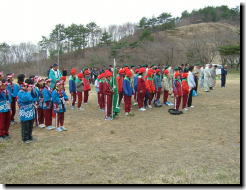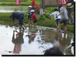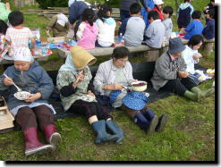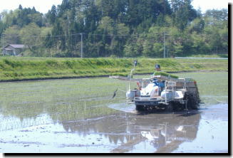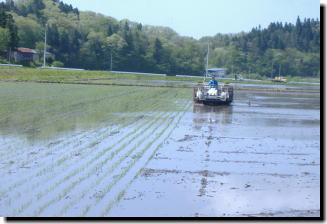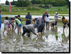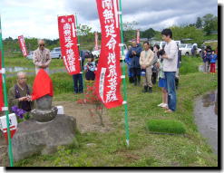 古くから伝わる言い伝えをもとに「地蔵田」のお田植えが、5月20日午前奥玉字坂下地内で行われました。地蔵田の場所は、昭和30年代はじめまで残されていましたが、その頃の第一次区画整備でなくなったと言われ、地蔵田伝承会(伊藤薫代表)が16年春に伊藤薫さんの水田に復元し4年目を迎えたものです。地蔵院の大場浩俊住職が、設置した地蔵様に焼香し、五穀豊穣・安全祈願の供養を行い、大場住職が植え初めをしました。 晴天に恵まれ、千葉直喜さんらの指導で、千葉カノエさんの田植え歌などにあわせ、寺子屋生(書道塾などに通う子どもたち)や寺院役員・地域関係者など約40名の手で円形の田んぼ約2アールにひとめぼれの苗をにぎやかに手植えしました。(写真上右・下左)たばこどきに小豆ごはんで作ったおにぎりや漬物、ジュース等いただき黄金の波となり収穫できることを祈りながら、慰労がされました。(写真右下)秋の地蔵講で本尊の水引地蔵等に奉納し、収穫祭が行われます。 一方、周りの基盤整備水田の田植え作業もおくたま農産で効率よく行ったことにより昨年10日かかっていた田植えも一週間17日までに終了し、奥玉地区内ではあともう少し残っています。