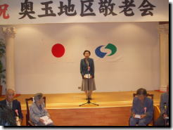 一関市奥玉地区敬老会が、9月12日(金)午前10時30分からマリアージュで開催され、80歳を迎えた奥玉地区307名対象者中当日出席153名を迎え、来賓・奥玉地区福祉活動推進員など約80名と奥玉保育園園児14名などで祝福しました。 藤野晃奥玉地区福祉活動推進協議会長が開会のあいさつをのべ、一関市長浅井東兵衛氏から「市の発展は皆様方の地域発展に対する強い意志と弛まぬ努力の積み重ねに感謝申し上げます。豊富な経験を生かされ、ご壮健で地域発展のため、ご活躍下さいますようお願いします。」と主催者あいさつを。(写真上左)一関市議会議長(村上悌一関市議会議員代読)・千葉康一郎岩手県議会議員ら来賓祝辞・紹介・達増拓也岩手県知事らからのメッセージ・祝電紹介をしました。