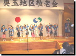奥玉保育園児・「在郷サンバ」など3婦人会踊りで80歳以上敬老者を祝福