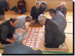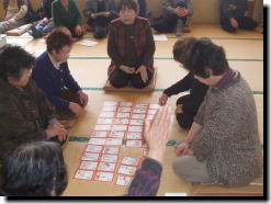 (解説)「お茶ぱたき」というのは、お茶を飲みながら歓談することをさす方言ですが、平成10年に町社会福祉協議会と町老人クラブ連合会等が中心となって、「千厩町をボランティアの笑顔とやさしさの手でつくろう」とカルタづくりが行われました。当時の千厩高校美術同好会がカルタ絵を作成、文面は各老人クラブで44枚に普段の生活の留意点や健康を取り戻そうと創意あふれた文になっており、毎年お正月時期を中心にカルタ大会が行われているものです。