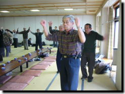 翌日は、西和賀町の小林輝子さんを講師にお元気講座「民話と山菜について」の講話をおこないました(写真下左)。湯川地方に伝わる民話を子どもの頃祖母から聞いて調べた。民話は活字にすると面白くなくなるが、語りにより面白いと思った。民話のおしまいは地方によって違ってくる、この地方は「とっぴんはらりのぷ」遠野は「どんとはれ」で終わる。「やまやのへっぴりじいさま」の民話を聞きました。湯川の民話には食べ物の話が出てくる。この地方の人達は飢饉にあったとき金銀財宝より食べ物が欲しかったのではないかと思う。山菜取りから料理方法について、山の物は調理するときは光を遮り山の条件と同じくすると良い。赤ふきを白ふきになる料理方法、うどの美味しい料理方法などを聞き特に女性の参加者は質問をしており山菜料理の方法が増えたのではないか。講話の後村上恵子公民館指導員の指導による体操をして体をほぐしました(写真下右)。参加者は車中でも楽しいお話で終始なごやかに、そして心身とも若くなった感じで帰ってきました。