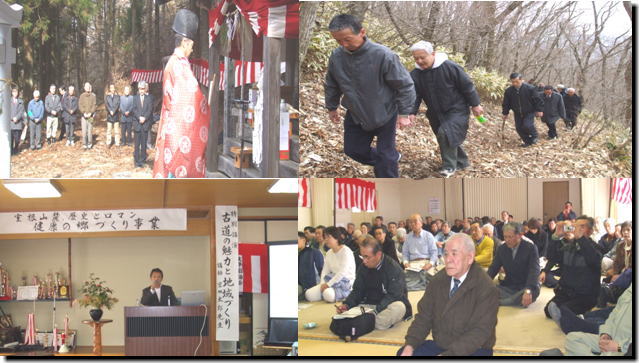 「室根山麓(さんろく)・歴史とロマン・健康の郷(さと)イベント」(奥玉振興協議会・奥玉愛林公益会など主催)が3月22日、奥玉の飛ケ森森林公園で開かれ、130人あまりが参加しました。奥玉側から室根神社に続く古道や周辺の寺院、史跡の歴史的、文化的価値を発信しようとトレッキングなどが行われ、参加者が歴史を感じながら"岩手の熊野古道"を楽しみました。 荒沢不動堂で行われた開会行事では、奥玉振興協議会の菅原一郎会長が「室根神社に続く古道をはじめ、ふもとにたくさん残る寺院、史跡をPRすることで地域おこしにつなげ、健康づくりにつながるトレッキングができる郷(さと)づくりを進めていきたい」とあいさつがあり、来賓祝辞やもちまき・郷土芸能奉納などがありました。
