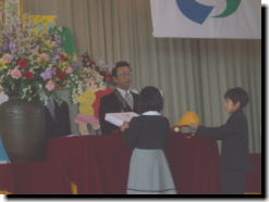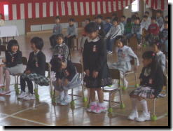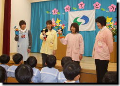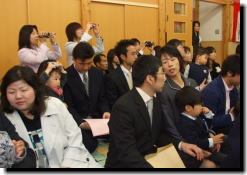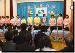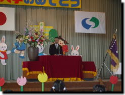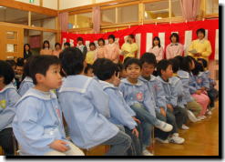奥玉保育園(昆野範子園長)の平成21年度入園式が4月3日午前9時30分から同園内で、お父さんお母さんや多くの来賓が見つめる中で行われました。 今年度の園児はさくら組(5才児)12人、たんぽぽ組(4才児)15人、ばら組(3才児)17人そしてすみれ組2才児4人と1才児7人にひよこ組(0才児)2人の57人になりました。式では園長先生が「よい子の皆さん入園おめでとう。保育園には楽しい遊びがいっぱいあります。当園では健康や安全面に気を付けきめ細かく指導しています。お父さんお母さんご安心下さい。」とあいさつ。来賓を代表して奥玉小学校長(伊東武夫校長)が「今日から新しいお友達と一緒に新たな生活が始まります。保育園と家庭が共に見守るようにお願いします。」とお祝いを述べました。さくら組とたんぽぽ組のみんなが「きみたちきょうからともだちだ」を歌い、先生方は人形遊び「チューリップ」などで「いっぱい遊びましょう。待ってるよ」と歓迎を表していました。「ウチの子は昨日の夜から入学式を楽しみにしていました。」とばら組菅野麗凪(れいな)ちゃん、ひよこ組隼飛(はやと)くんのお父さん貴文さんが話してくれました。式が終わった会場では園児やお父さんお母さん相手に、五嶋秋子専任交通指導員と佐藤奥玉駐在所巡査長が交通安全を呼びかけていました。