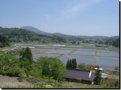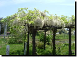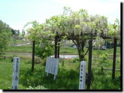 21年まぶしい緑の季節の奥玉。写真上は、義経伝説の「白藤」が満開に。下は、橘城から室根山を望む。