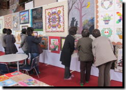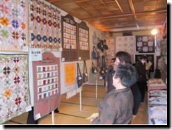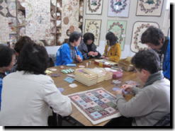 パッチワークやキルトの魅力に触れ、「絆」の大切さを感じとっていました。会場には東京キルト祭奨励賞「絆」の特別展示や古布の販売、コーヒーコーナー、直接指導会(写真右下)や映画「キルトに綴る愛」の上映もあり愛好者は、作品の多さにびっくりしていました。