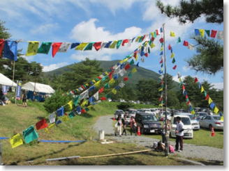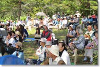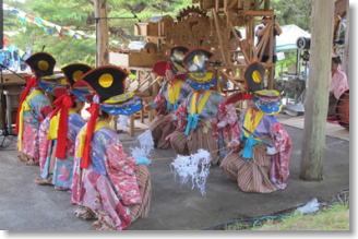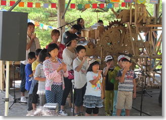 9月7日、室根山をバックに青空の下で「とびがもり水車音楽祭」が一関市千厩町の飛ケ森キャンプ場で開かれました。〜回せ、鳴らせ、種まきMILL in 飛ケ森〜音楽・アートと地域力のコラボレーションのテーマで最高のロケーションの中、ライブを楽しみました。いろんな人が関わってできた手づくりの水車を動力に太鼓や木琴、シンバルなどの楽器が一緒になって歌や郷土芸能とコラボされました。午前は、「あらたまキッズ」(写真左上)、「ドリームキッズ」のこどもたちに続き、サブステージでは「Wao!」演奏。からくり水車に合わせ、中日向鳥舞保存会が鳥舞(写真左下)とめでた節の歌と踊りを披露。午後には根山うちばやしなどが、盛り立てました。「Taka2」、「音楽水車プロジェクト・バンド」のジャズと水車の競演などが繰り広げられました。 観客席はテントデッキや木の下に家族連れで訪れている方も多く(写真右上)、レストランあさひやさん提供の奥玉の食材を使った料理も奏でられ、振るまわれました。小梨のたまご湯足湯や屋台もでて高原の空気を吸いながら、地域の元気を感じ取っていました。(写真右下)